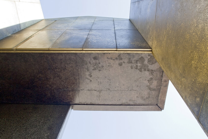 the project sits like a ring placed over the terrain, with its funnel-like roof forming a shaded perimeter walkway and an introverted core.
