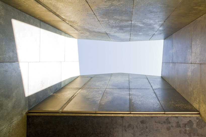 a vertical cut in the wall introduces a visual connection to a nearby cemetery