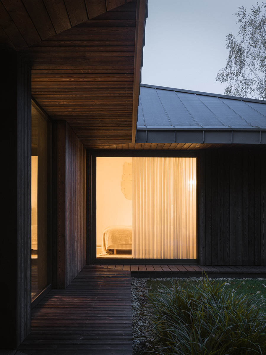 the low-rise structure, clad in charred wood siding, stands amid the trees