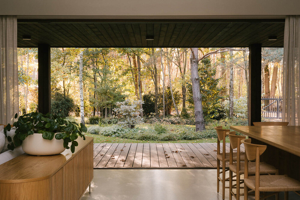 expansive sliding glass doors dissolve the boundary between the cozy interior and the natural exterior