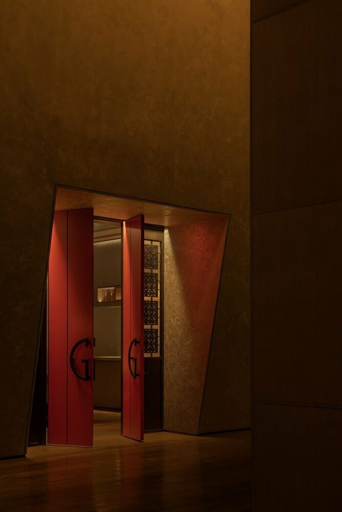 From the first courtyard, guests proceed through a door adorned with flowers, along a winding corridor, towards the central courtyard. Beyond the central courtyard is the third courtyard which is connected to a semi-open banquet hall. The ceiling and upper walls of this hall are decorated in gold lacquer, which together with the grey walls and crimson door posts, create an elegant, contemporary atmosphere. ‘On a sunny day, this gilded hall changes with the light and shadow, as if it were breathing,’ lead designer Liu Daohua shares.