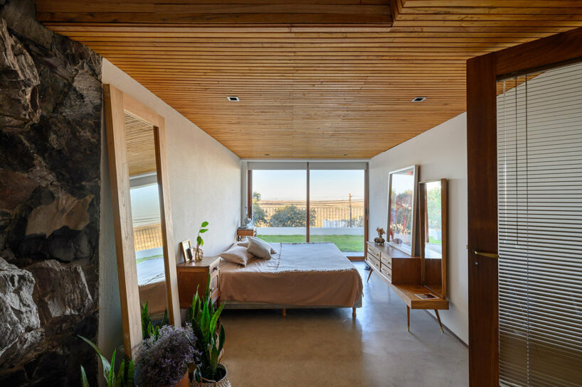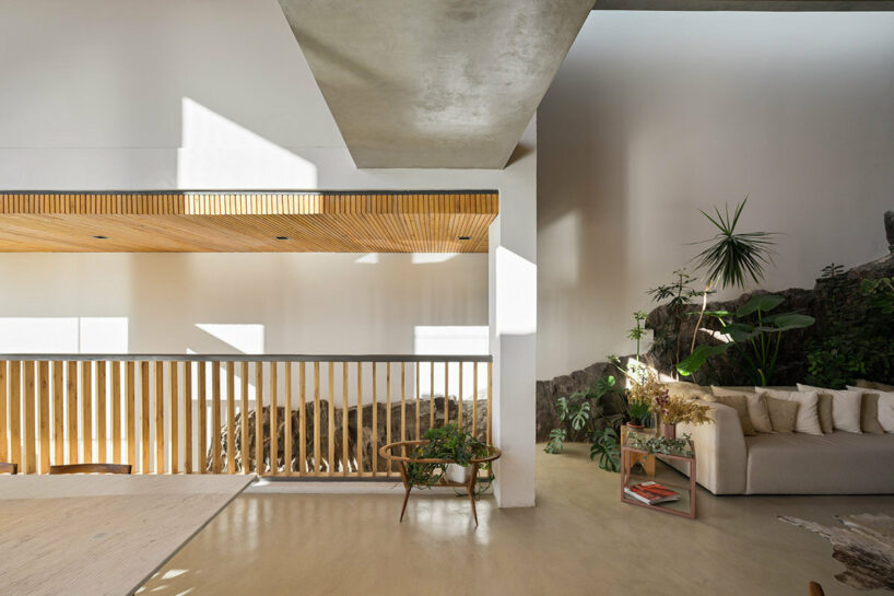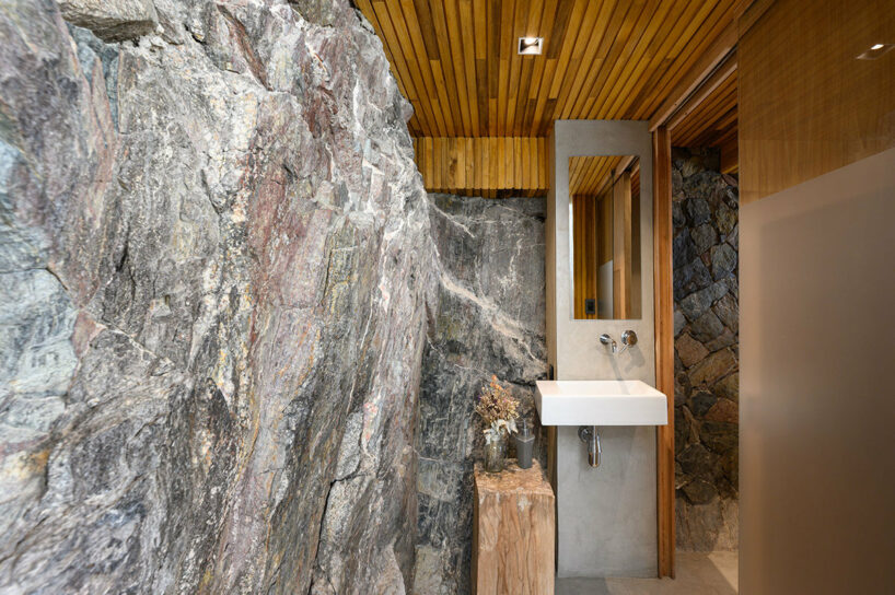 minimalistic finishes of wood and natural fibers harmonize with the exposed rock