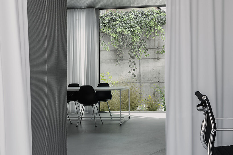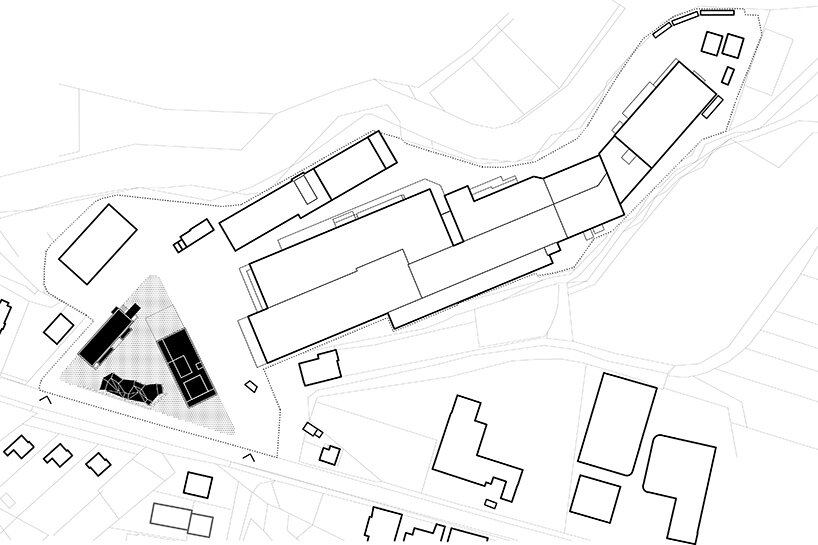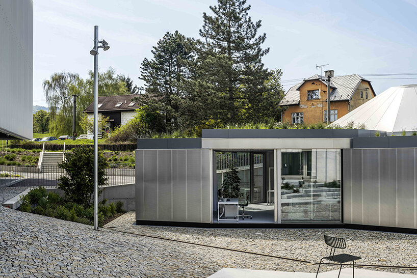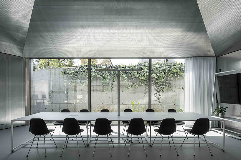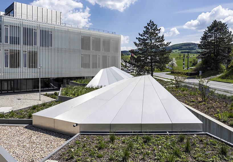 the project sits like a ring placed over the terrain, with its funnel-like roof forming a shaded perimeter walkway and an introverted core.