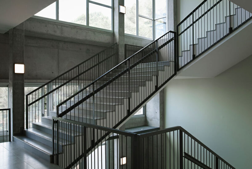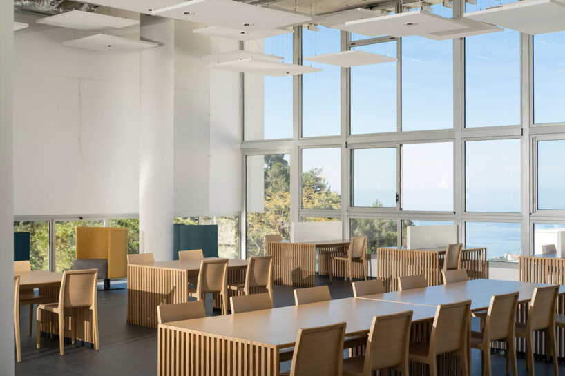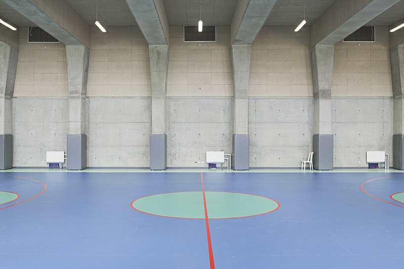 the project sits like a ring placed over the terrain, with its funnel-like roof forming a shaded perimeter walkway and an introverted core.