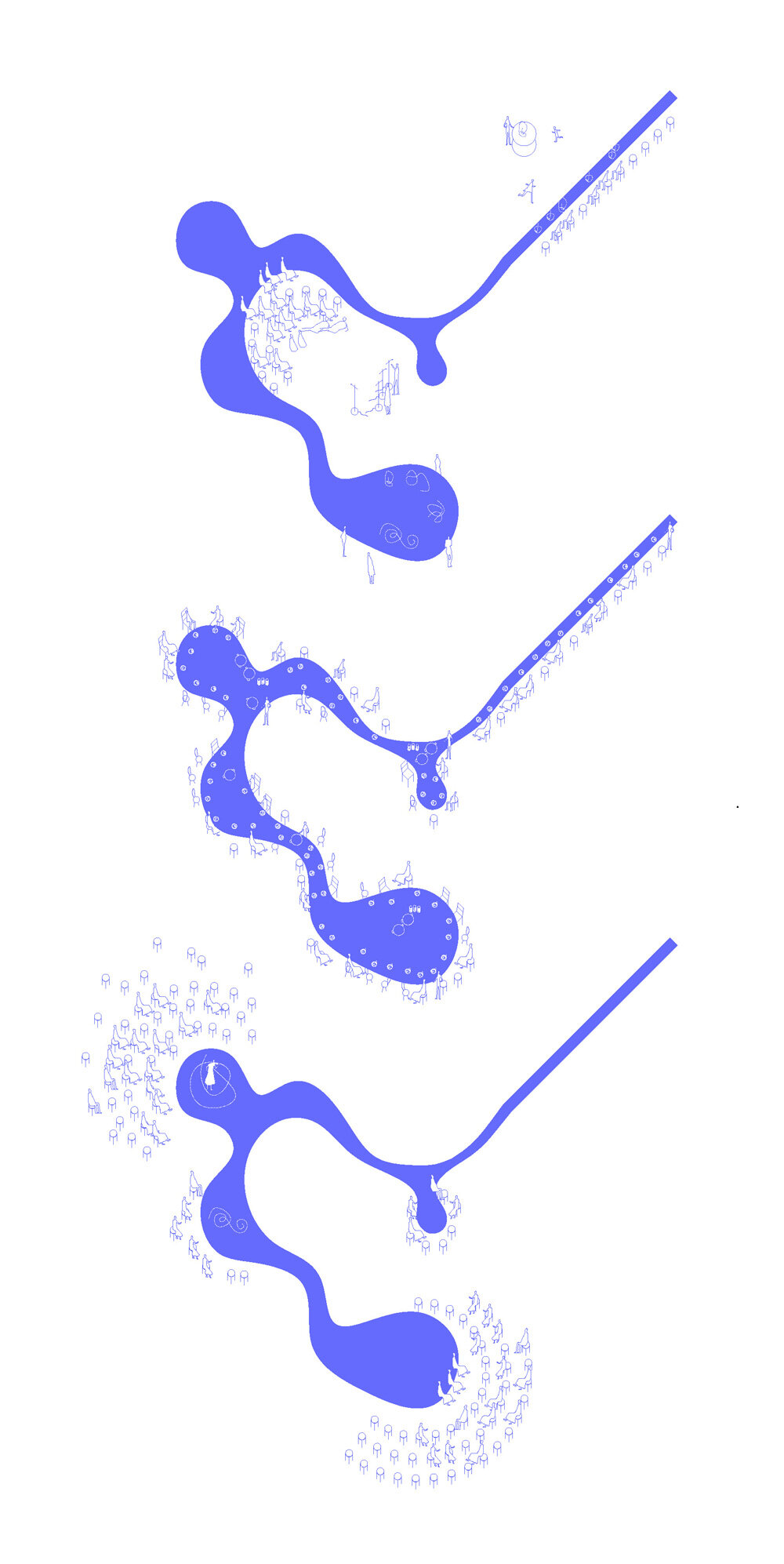 the project sits like a ring placed over the terrain, with its funnel-like roof forming a shaded perimeter walkway and an introverted core.