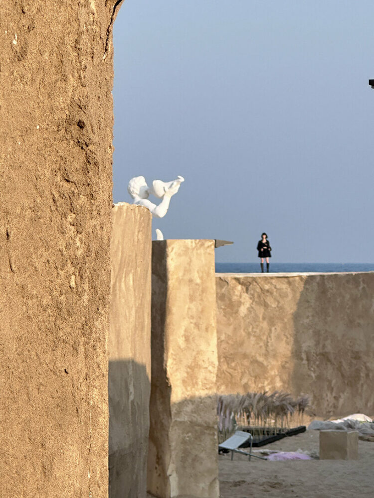 the project sits like a ring placed over the terrain, with its funnel-like roof forming a shaded perimeter walkway and an introverted core.