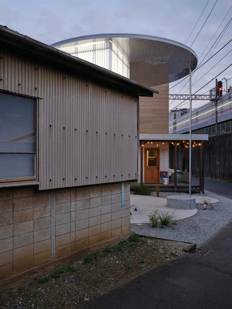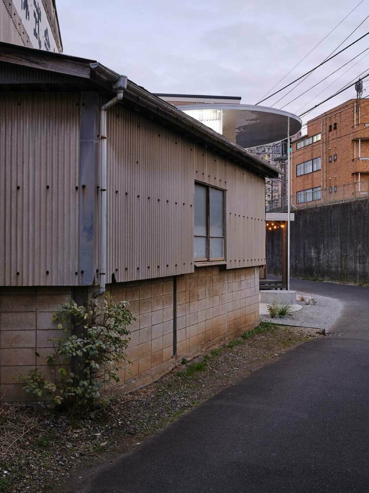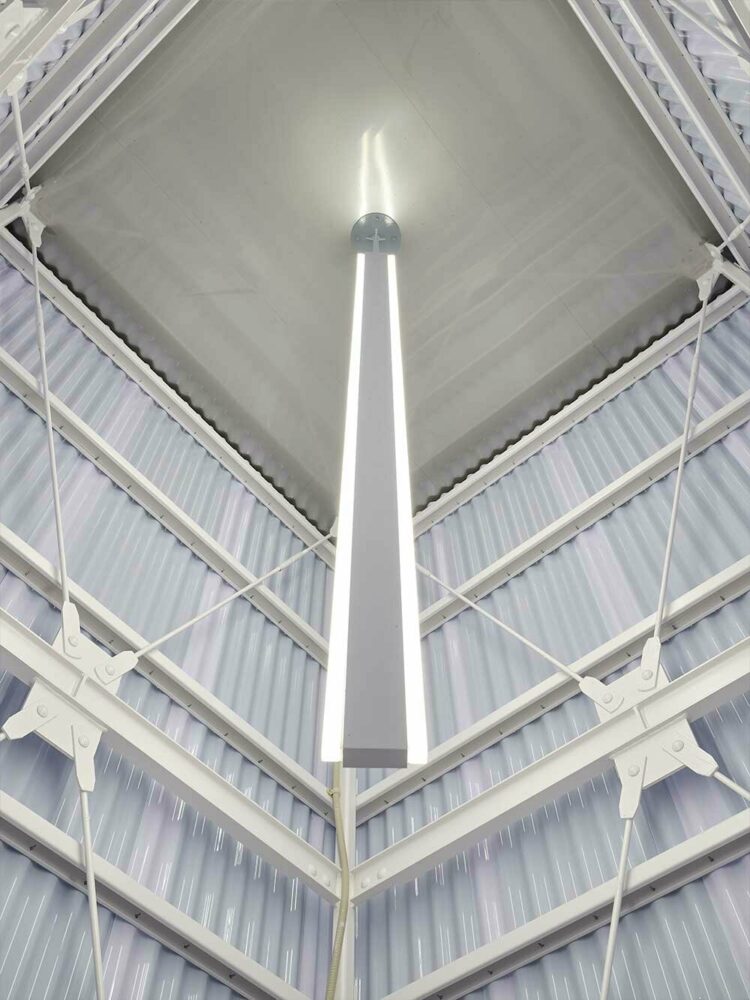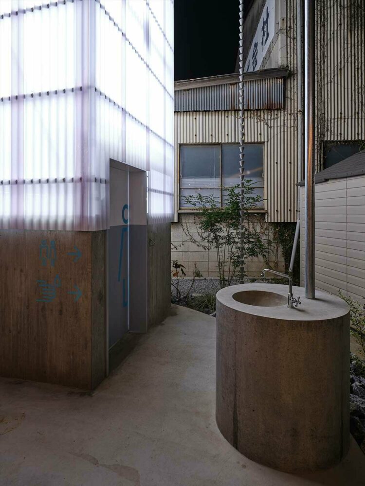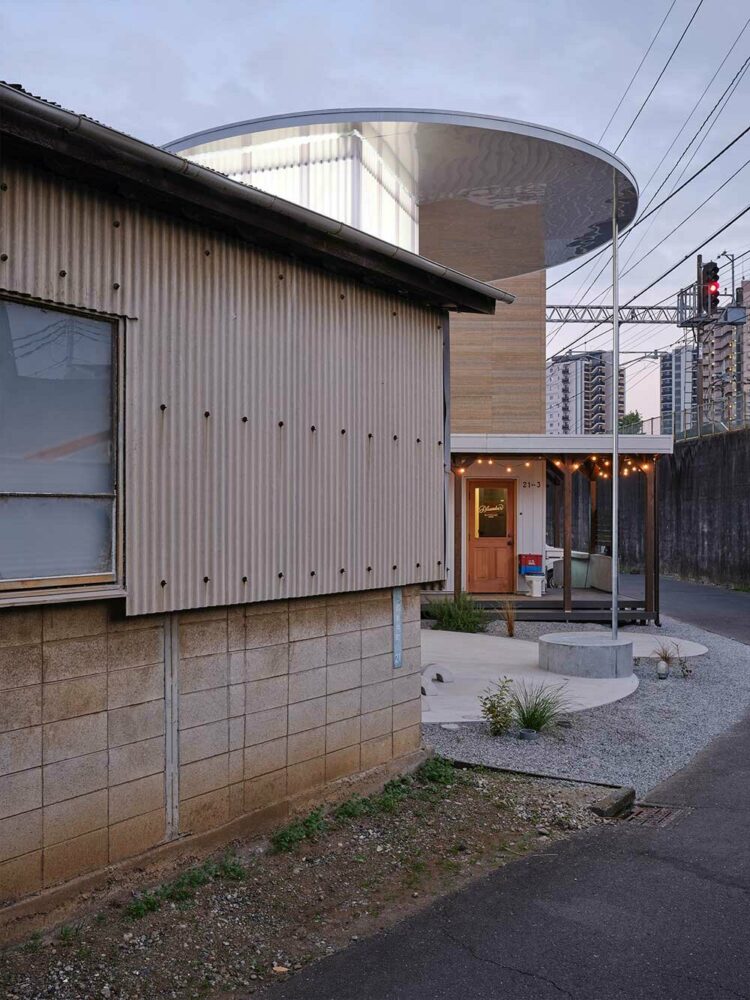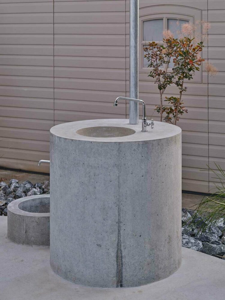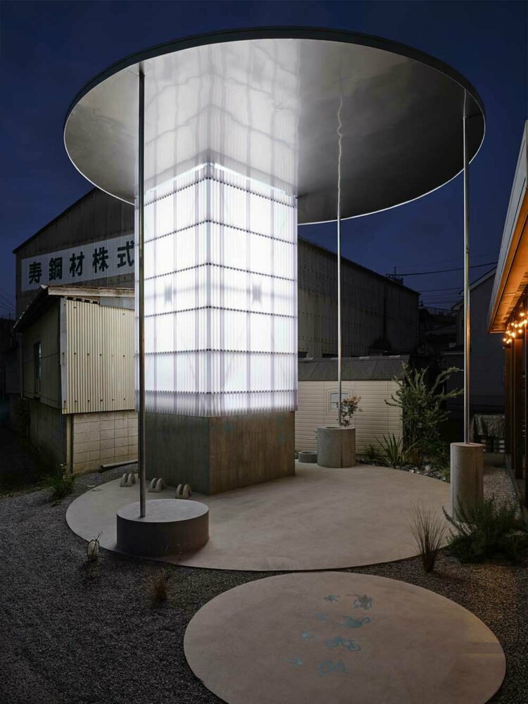the project sits like a ring placed over the terrain, with its funnel-like roof forming a shaded perimeter walkway and an introverted core.