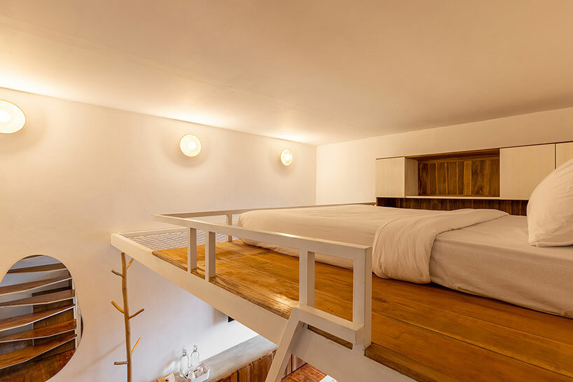 Designed by the Indonesia-based studio, the project carries a co-living concept for those who looking for a cozy working environment while also expanding their network. The intricate structures made of bamboo are a sensitive response to the existing context, developed with sustainable consideration. The communal area is set under the massive bamboo roof, spanning two levels, with a wooden ramp connecting the two floors. On the upper level, users can work and enjoy the view of the pool while a series of curves calm the eye, exuding a soothing atmosphere. The ground level boosts interaction and gathering, as in addition to the working space, it features a fully equipped kitchen where users can cook, catch up and share ideas. The private rooms include a spacious balcony with direct access to the pool and communal area. They are designed to maximize the user’s comfort, combining work and vacation.