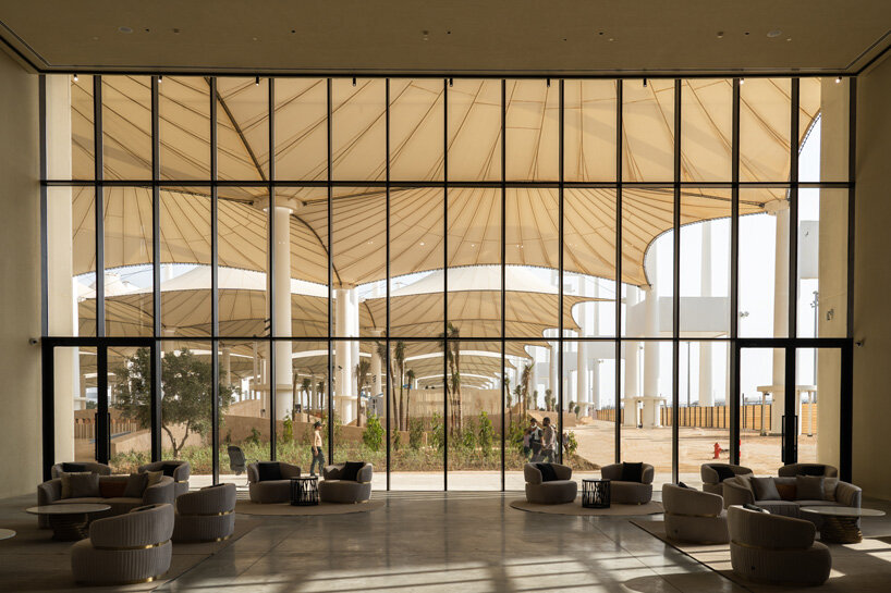 the project sits like a ring placed over the terrain, with its funnel-like roof forming a shaded perimeter walkway and an introverted core.