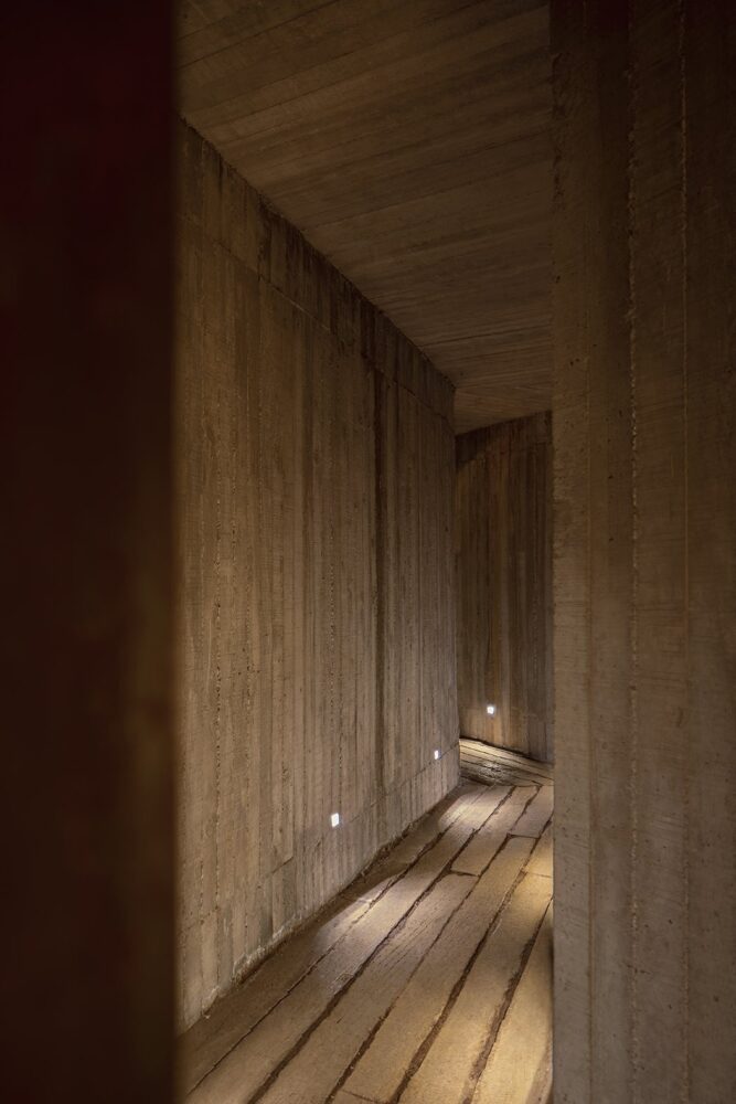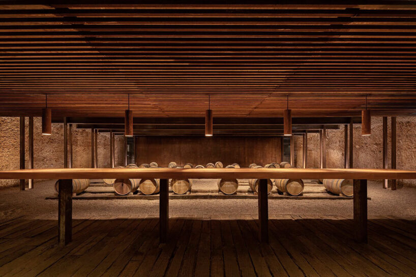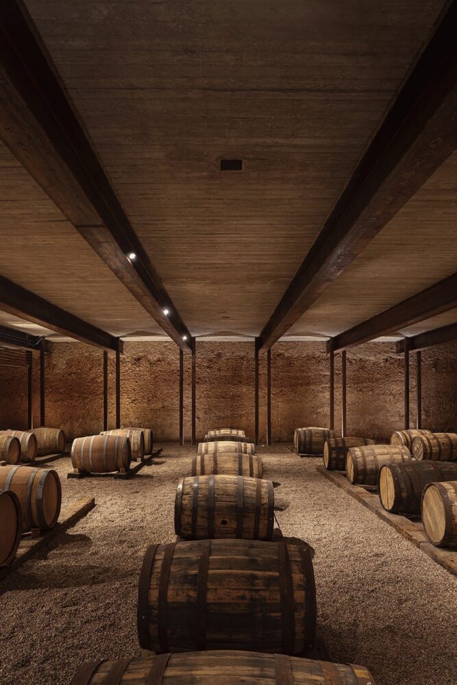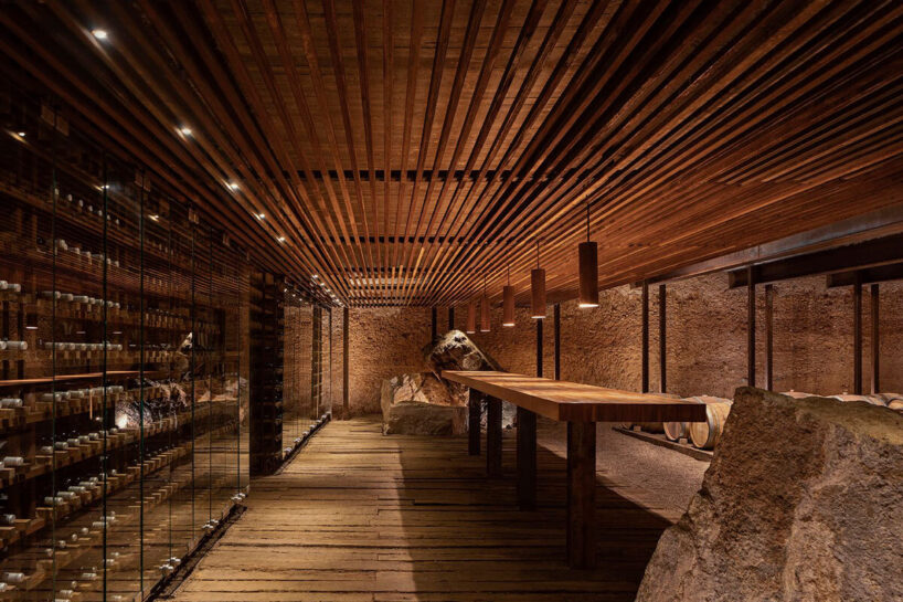 the cellar creates a dramatic atmosphere into the space, designed for wine maturation and tasting