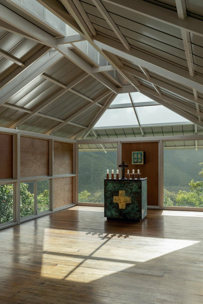 ‘a stunning site, which the chapel has a symbiotic relationship too. the interiors are particularly striking, the way it admits light and creates the experience of the cross, created with light as well as shadow. the interior creates a frame for experiencing the verdant outdoor environment,’ the jury comments.