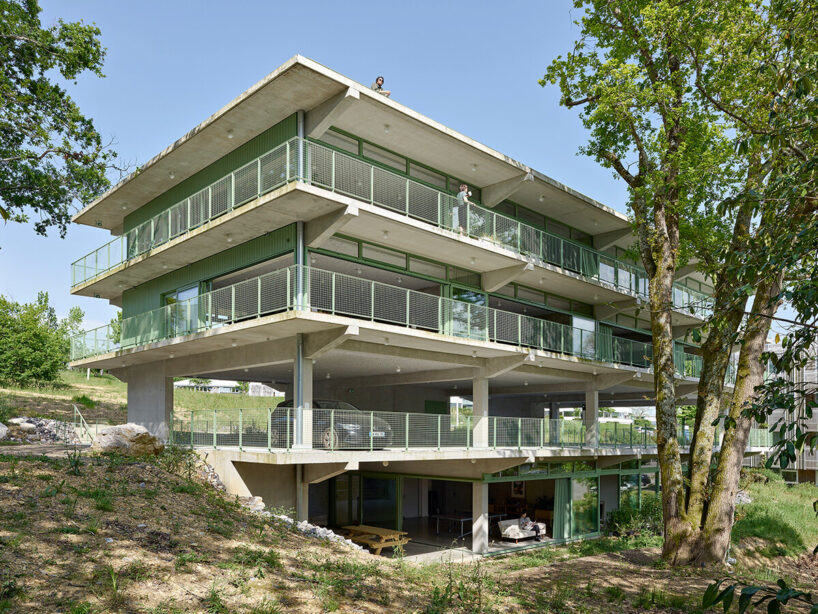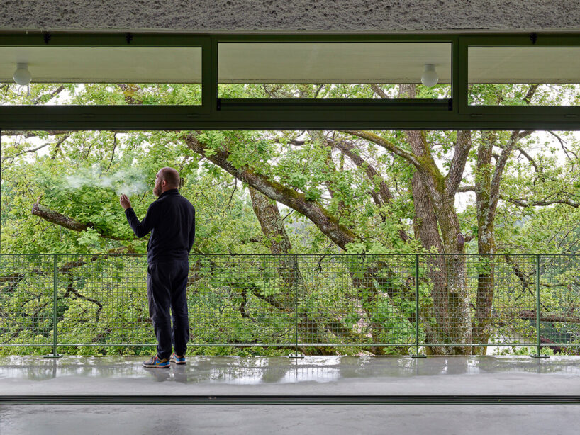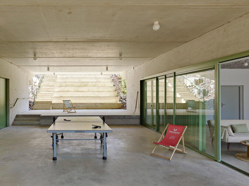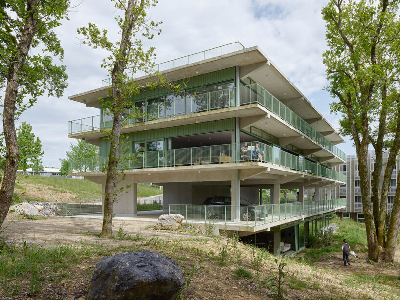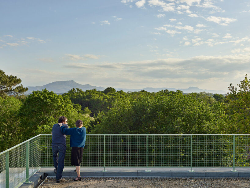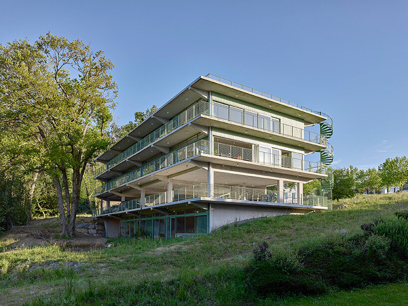 the project sits like a ring placed over the terrain, with its funnel-like roof forming a shaded perimeter walkway and an introverted core.