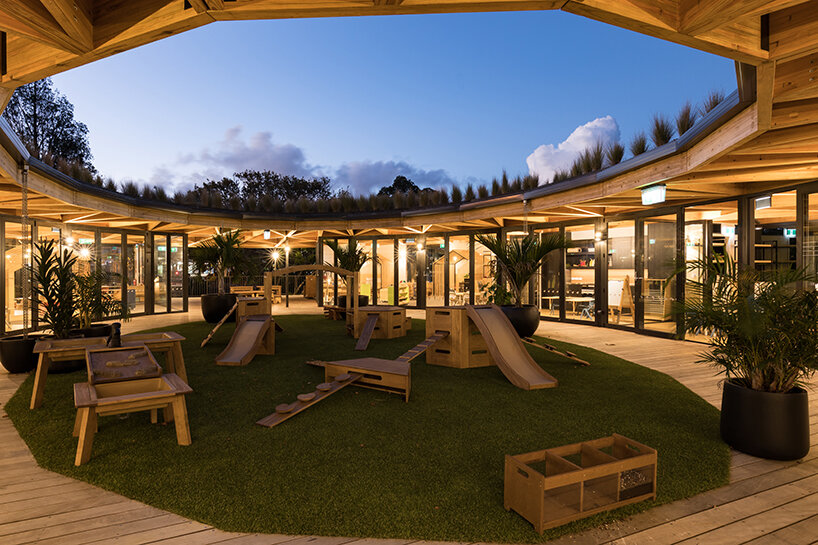 The architects derived the shape of the ‘Kakapo Creek’ center from the shape of the stream at the site boundary on the northern side, helping root the building in its place. This sense of connection extends inwards, with four fully-glazed classrooms that open onto the playground, linking inside and out and between the rooms themselves. Such extensive glazing encourages natural ventilation and brings in plenty of daylight throughout the day — eliminating the need for artificial lighting or cooling. kakapo creek childrens garden a place where connections between children and the natural world are fostered 11