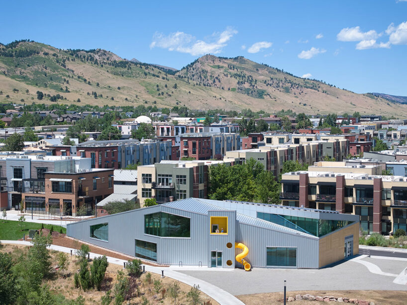 the project sits like a ring placed over the terrain, with its funnel-like roof forming a shaded perimeter walkway and an introverted core.