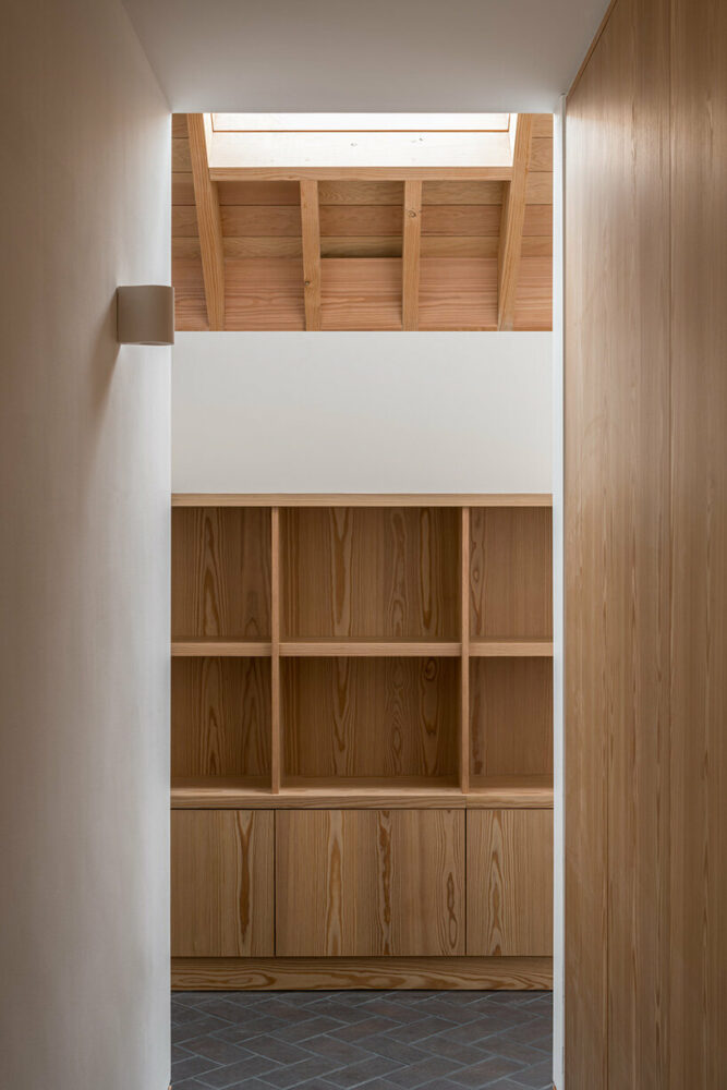 Along the exterior, Manea Kella wraps its Colston Bassett barn house in Siberian Larch cladding that has been wire-brushed and finished with a silicate-based wood protection — the group extensively researched treatments for accelerated weathering. This attention to detail will ensure a both a long life and a surface that will naturally age into a beautiful grey tone and ubiquitous texture.