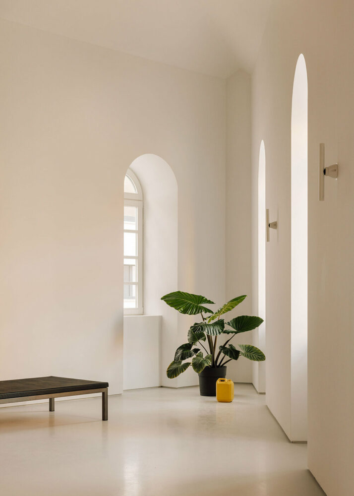 Inside the Mártires Housing Complex, each apartment has its own identity, reinforced either by surrounding views of Leiria or architectural details of the pre-existing house. Some of the flats exude a cozy and intimate atmosphere, with small windows connecting to the interior backyard of the building, while others are generously open to the outside with big windows and roof terraces. Despite these differences, the team at Bureau des Mésarchitecture has defined all interiors by soft colors: light gray walls, comfortable epoxy floors, and wall paintings. They feature exposed elements of the concrete structure, birch doors, and furniture mixed with alpine stone, offering a warm and soothing ambiance.