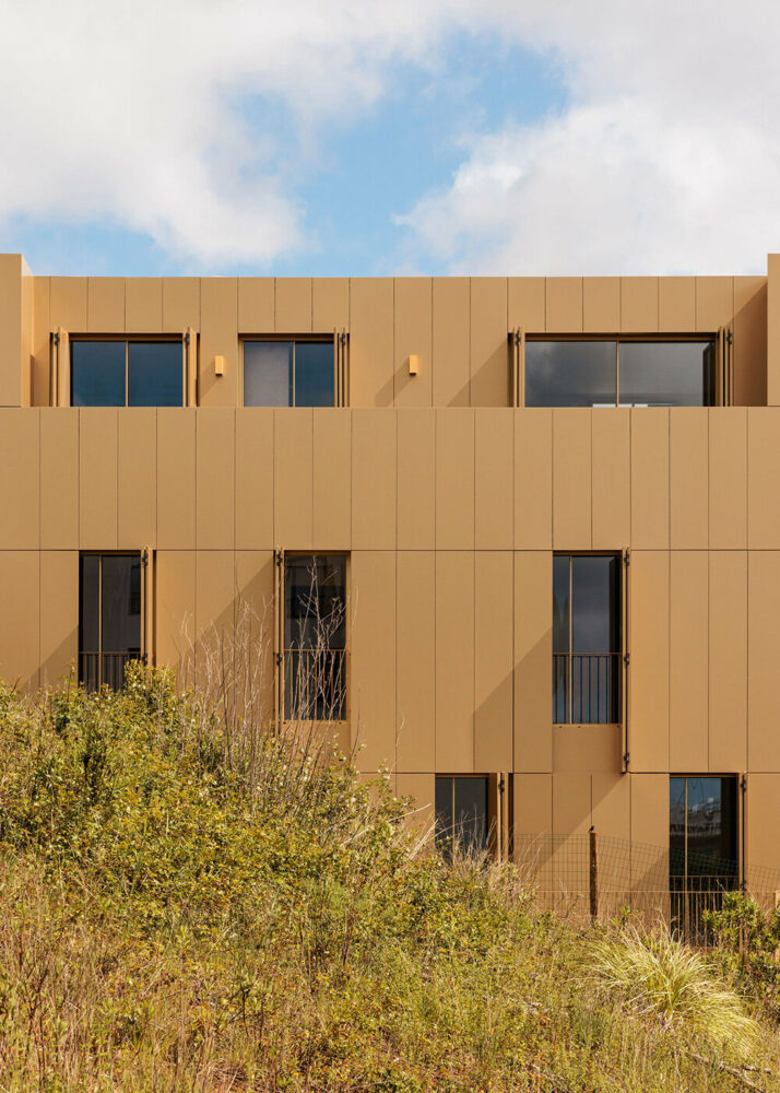 Bureau des Mésarchitectures’ Didier Fiúza Faustino has completed a housing complex in Rua dos Mártires, Leiria, Central Portugal. Wedged between a wide modern avenue featuring new construction and a narrow old street that leads to the city’s historic district, the residential project combines the renovation of a pre-existing small house with a new extension. It features seven apartments as well as a shared private parking zone. The four-story building is a hinge between these two urban conditions – a developing area with tall buildings and a narrow street with squat houses. Faustino addresses the site’s conflicting realities with a paneled facade of precise geometry, materiality, and rhythm, boasting a curved footprint and overlapping concrete panels with golden windows.