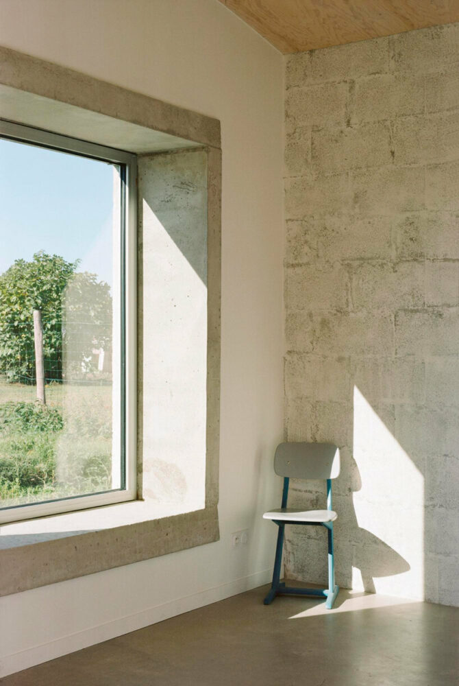 The second gesture is removing a roof between two existing volumes to shape a patio. The new outdoor space, directly linked to the terrace of the extension, is well-protected from the wind allowing for an alternative atmosphere and use. These two operations result in a project made of juxtapositions of volumes, circulation, usages, and materials. Exposed concrete frames are poured on-site to form large openings, as well as to reinforce the walls.