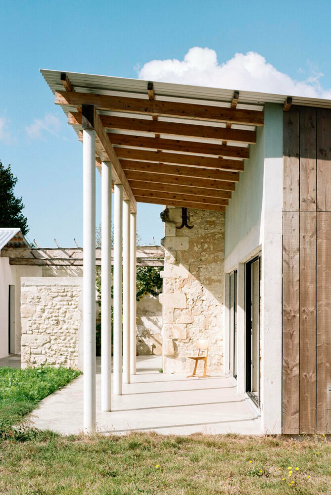 The new extension develops its material character through a juxtaposition of three elements: a largely closed timber facade on the street side, an exposed concrete portico with three posts and a beam, and a monumental colonnade made of five round polished concrete columns, on which stands the timber roof structure that defines the shape of the volume. Through the project of ‘House Near Bordeaux’, the design team initiates a dialogue between old and new, generating curious collages of raw materials, volumes, roofs, and geometries. Multiple openings allow for outdoor and indoor spaces to interlace through a variety of routes to use every day. In the winter, the wood stove burns quietly and one can unwind observing the water in the distance. In the summer, all windows remain open, and fresh air circulates fluidly throughout, moving around old stones and new elements, between the shelter and the landscape.