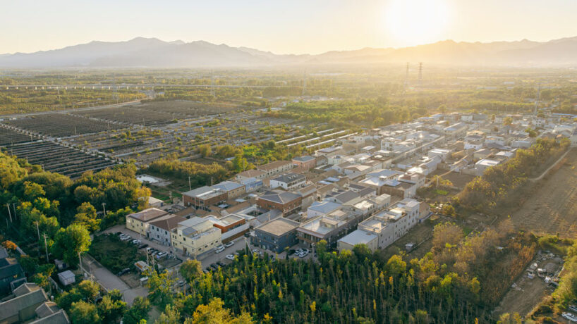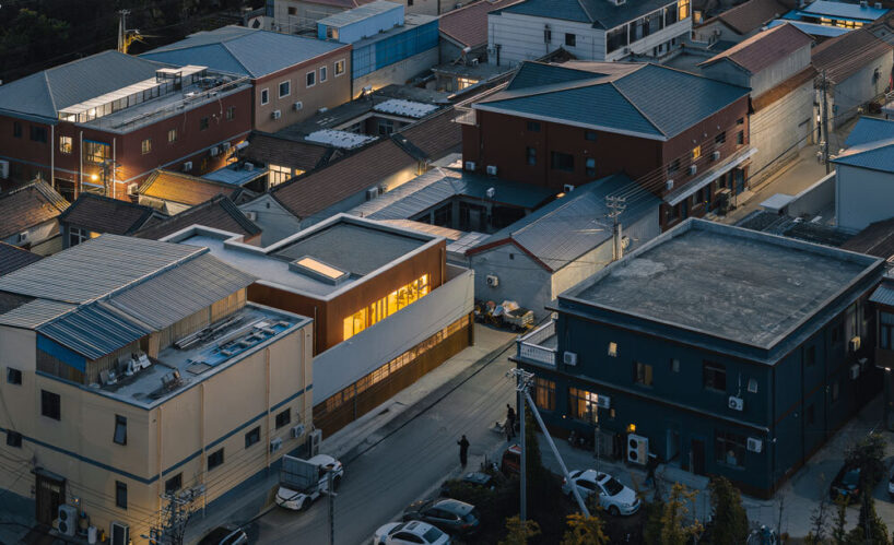 the project sits like a ring placed over the terrain, with its funnel-like roof forming a shaded perimeter walkway and an introverted core.