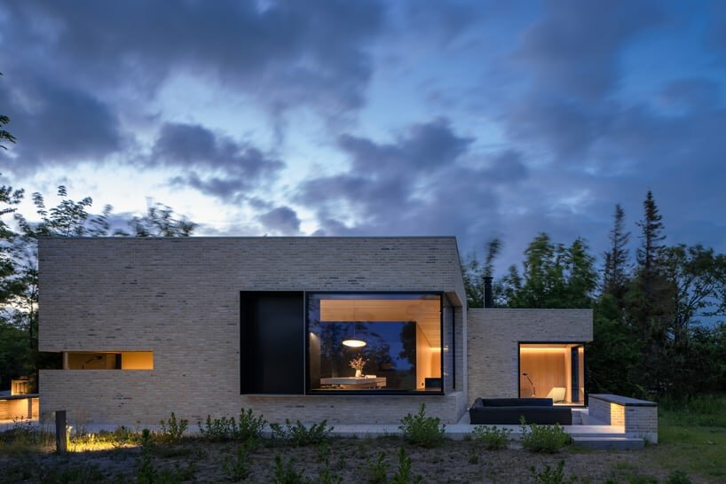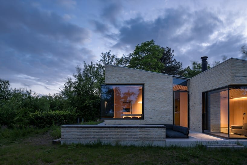 Located on a small park in the eastern inhabited Dutch Wadden island, Schiermonnikoog, the holiday retreat ‘Ferskûle’ by Denkkamer design group replaces the existing residential unit. Taking its name from the Frisian word meaning ‘hidden’, the residence nestles discreetly amongst rich greenery. Regulations on the island dictate a maximum gross building envelope of 110 sqm, leading to the design of the defined building structure within a compact site. The construction forms a conjunction of two solid volumes covered in yellow brickwork and penetrated by angular steel frames and glass windows. A gently sloping roof tops the frame merging it with its surroundings. The large corner windows cutting through the mass hold the main feature of the exterior while allowing open views from the interior retaining direct contact with the landscape.