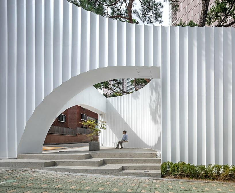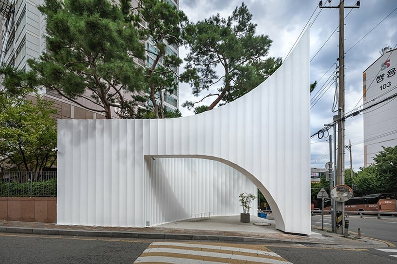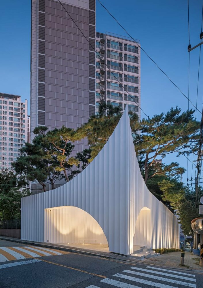 Like a delicate pair of wings, Drawing Works’ pavilion emerges against the mundane backdrop of a residential area in Gyeonggi-do, South Korea, extending to fence along an apartment complex. Sited on the block’s corner, the White Wing pavilion installs a curved metal wall with a corrugated facade to serve as a new entrance gate, reviving the image of the unassuming residences and activating a vacant public space. With its eye-catching form and serene enclosure, the pavilion provides residents and passersby a moment to step away from the bustling city, while demonstrating a vivid presence and function as a new public landscape of the area.