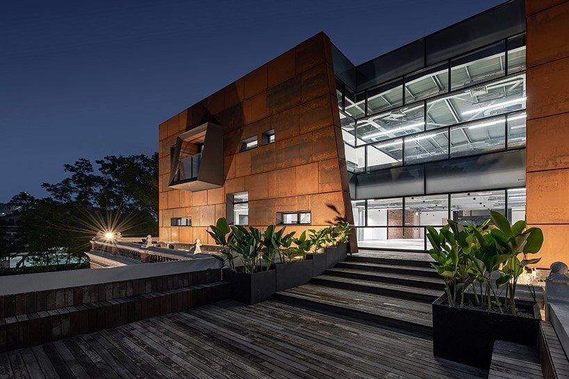 a central glass curtain wall breaks the homogeneity of the corten-clad new mass. the façade break enhances the quality of modern abstraction and conformity to the domineering and symmetrical colonial architecture below. office tenants are visually linked to the surrounding context by the window openings on the new corten-clad building skin. tranquil greenery is brought into the office interior through thoughtfully carved-out window openings.