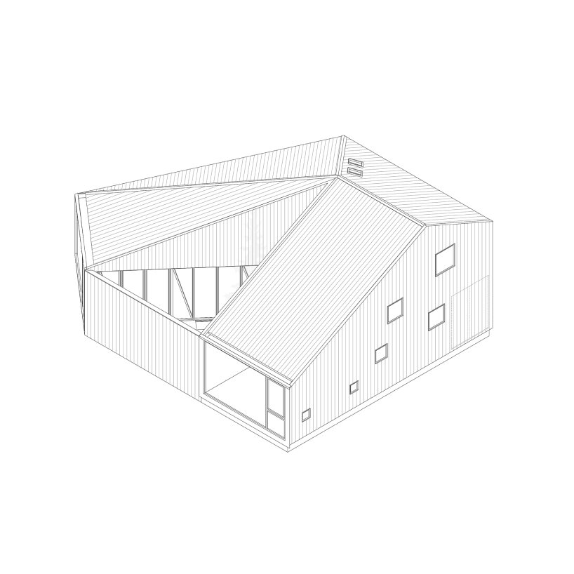 The House in Meliquina, nestled on the mountainside, occupies a 1500 square meter plot with the main floor spanning 100 square meters. moarqs has optimized the program to bring in abundant natural light and views of the environment, positioning two small bedrooms and a bathroom on the upper level, and primary living spaces on the ground level. Here, a 41-degree rotation forms an interior triangular courtyard amid the steep pitched roofs sloping in different directions, seamlessly connecting the night and day zones.