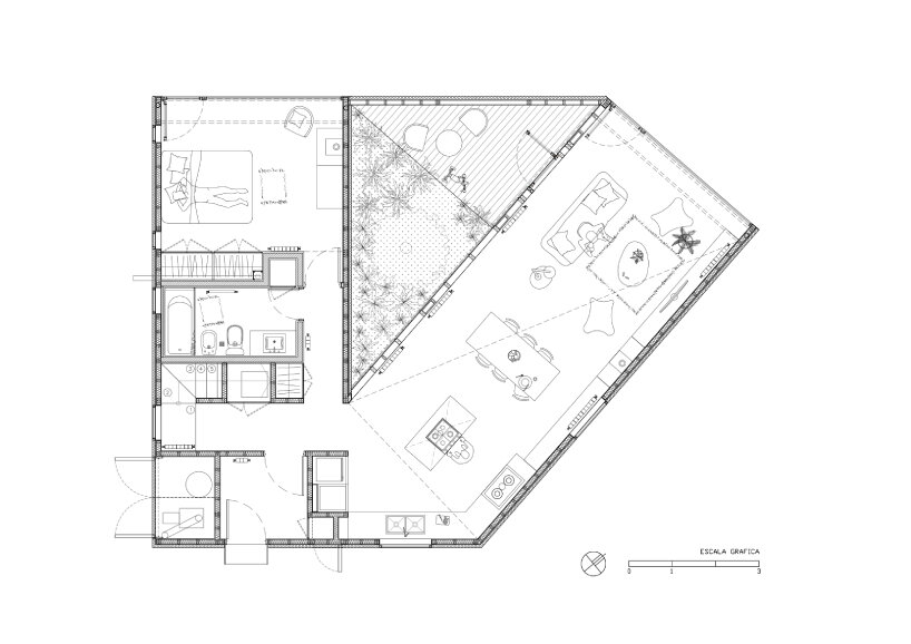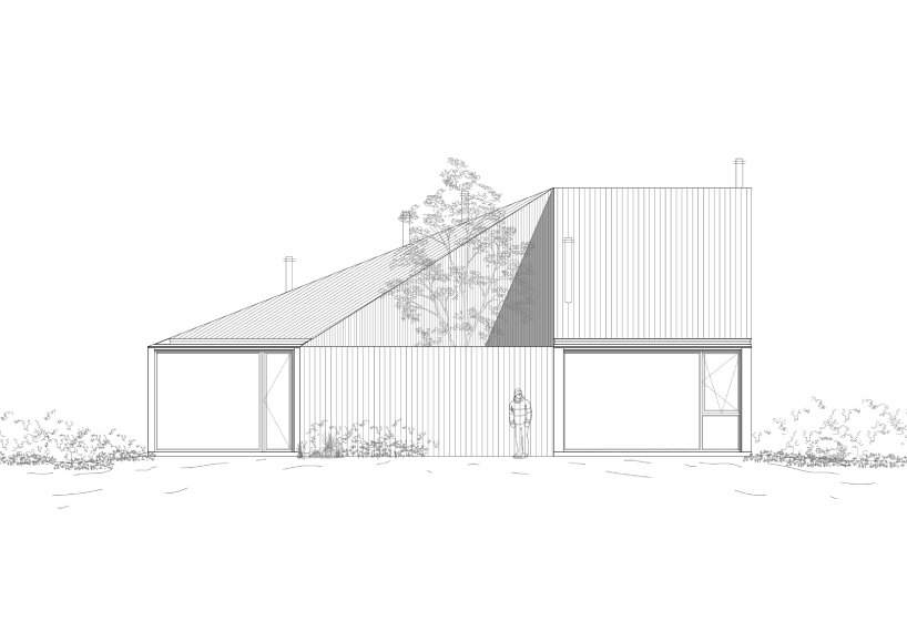triangular courtyard slices moarqs' remote, pitch-roofed house in argentina forest
