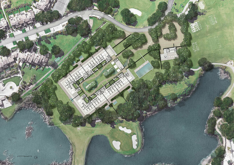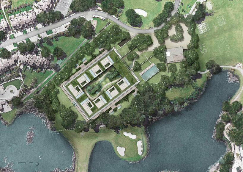 ‘San Lorenzo’ is a residential proposal in Algarve, on the south coast of Portugal, that takes its cues from the historical and contemporary heritage of the region. Designed by OODA, the result sees a cloister-like configuration that poetically interplays with the central courtyard, along with landscaped areas and terraces, thus obscuring the boundaries between nature and the built space. This feeling is further accentuated by the generous presence of pine trees, shrubs, and other undergrowth creating a visual continuity of the lush vegetation found on the surrounding golf course and lakes.central courtyard + terraces by OODA bring nature into cloister-like residential complex in portugal