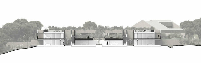 ‘Courtyards can bring a kind of poetic atmosphere to every project. There is an opportunity to play with the light, the sound, the access, the vegetation and the geometry. In our proposal, these are key spaces to acess to all units, an intimate and enclose space as the opposite to the wide views on the edge of the platform. Grammar and composition translate into simple gestures that resolve the topography as forms of dialogue with nature, not subtracting its qualities but rather maximizing their existing potential and assuming biophilia as a matrix of spatial and sensorial composition,’ explain the architects.