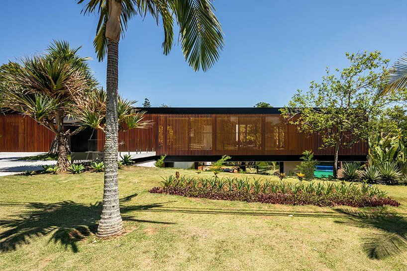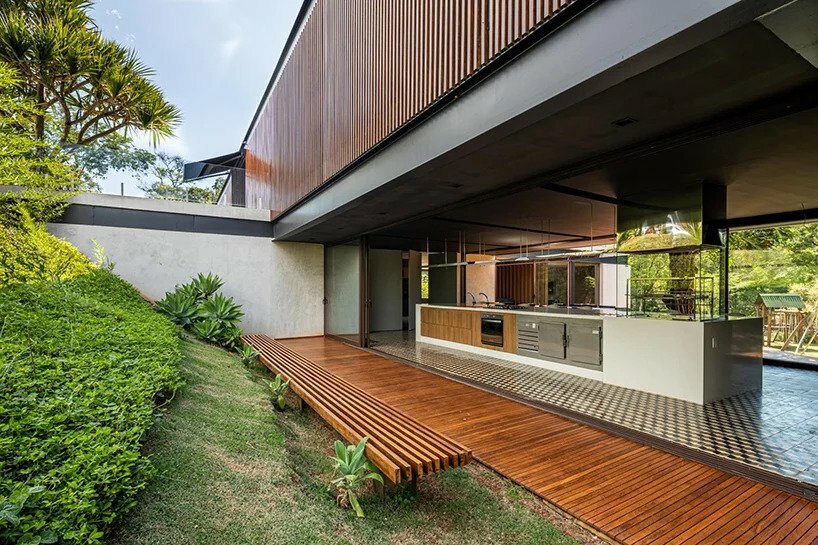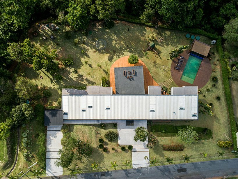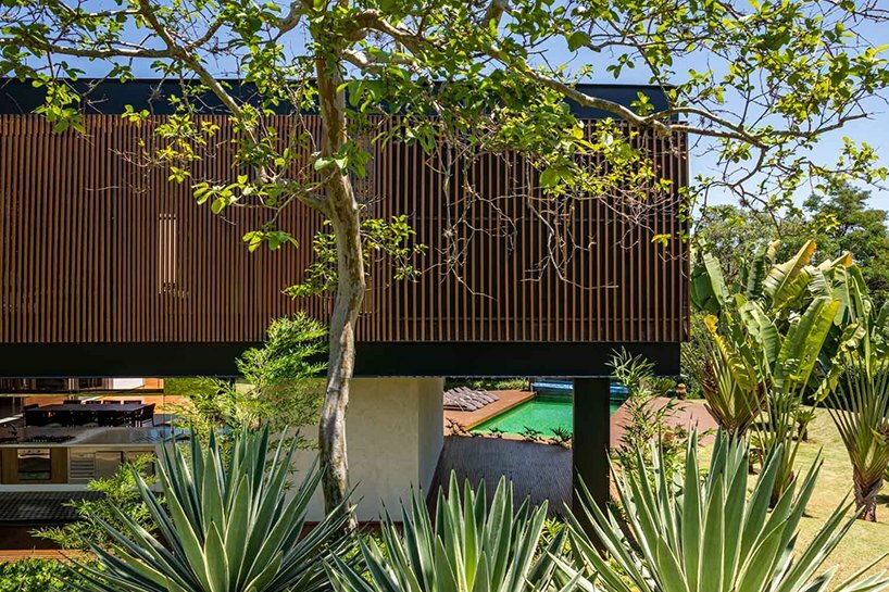 set in southeast são paulo amid lush greenery, ‘casa 17’ is a bold residential project completed by architects cristiano kheirallah and thiago giannini. with a built area of almost 1,000 sqm, the dwelling features two superposed volumes practically perpendicular to each other, erected on a composite structure (concrete and metallic) detached from the land and echoing the natural context.