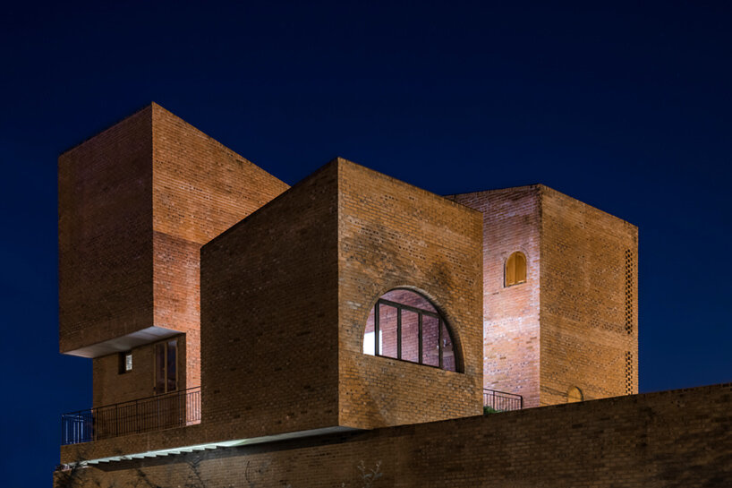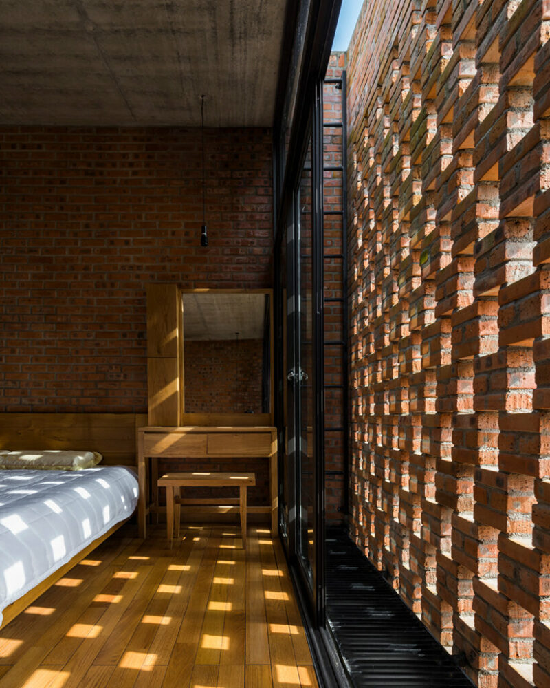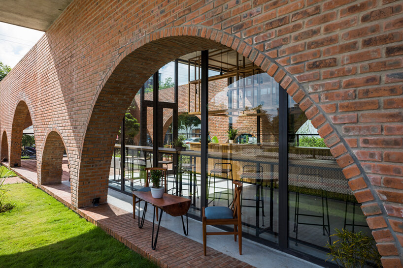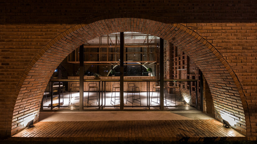 The architects at Tropical Space (see more here) make use of the Cuckoo House’s brick materiality to open up its interiors to natural light and to its surroundings. Windows take shape as brick arches, especially along the ground floor which is defined by its sweeping arcade. Actually this café is built as a glass box nested within the arcaded brick shell. Meanwhile, the upper levels integrate perforated brickwork to introduce natural filtered sunlight which further creates patterned shadowing.