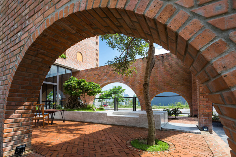 As part of a larger urban renewal project in central Vietnam‘s Da Nang, the architects at Tropical Space design this mixed-use Cuckoo House. The project sees a café along its ground floor and a private residence within the floors above, all housed within a cluster of large brick volumes. The public space on the street level takes shape as a simple rectangular block that opens outward onto a open-air courtyard while the private, single-family dwelling is organized between three large blocks perched on top.