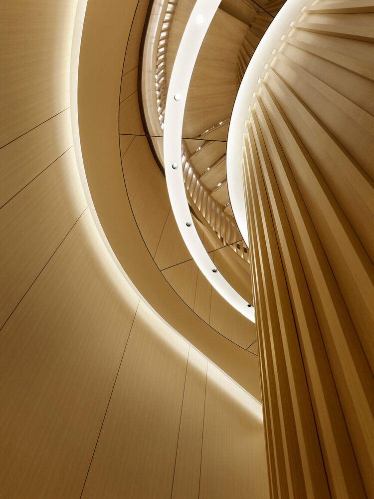 Exploring the interiors further, visitors stumble upon an immersive environment, a 360° digital frame inviting them to discover another dimension of the Rolex world. The room is carefully designed to invite customers to continue their journey to the upper floors. The symbolic lift catches the eye, surrounded by spiral staircases with travertine and wooden louvers conveying warmth and a welcoming ambiance. In addition to connecting four floors, the lift serves as a monumental feature in Rolex Flagship Ginza.