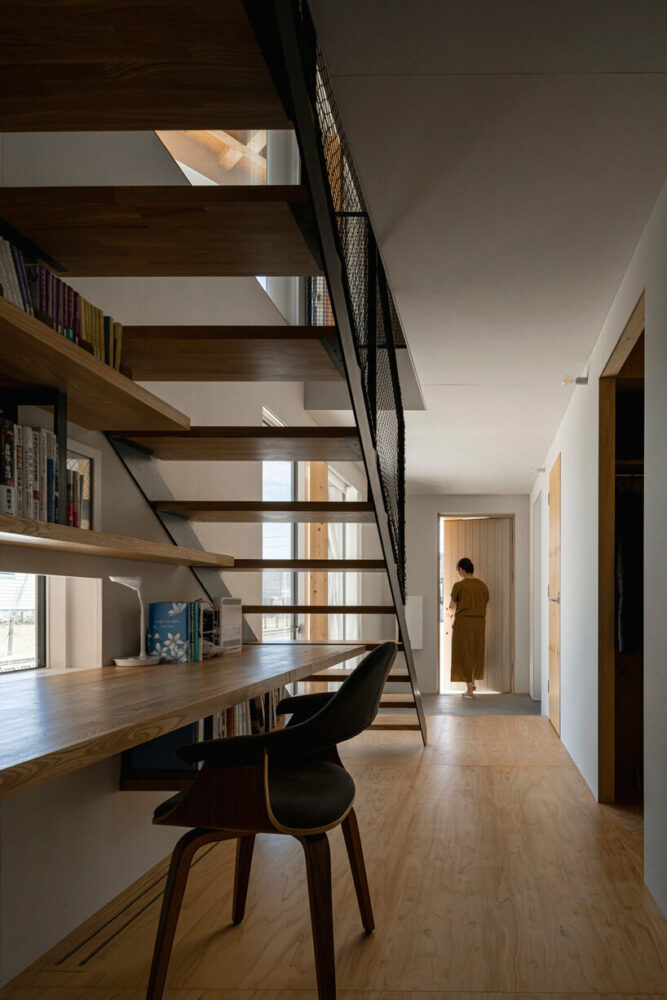 Ensuring the home’s eastern elevation directly faces the park, the architects have opted for large curtains to maintain a dynamic enclosure instead of external walls. Within is a partially enclosed space titled ‘outer living room, inner garden’. Made of timber, this serves as a flexible threshold between the indoors and outdoors, as well as a visual passageway between the openness of the neighbourhood and the intimacy within the home. As a continuation of the tranquil interior, the passage further ensures optimal natural light and views of the adjacent park can infuse the home. ‘The exterior curtains and large openings in the elevation resemble the drapes of a stage in a park. The expression of the building, which shimmers with the wind, may bring a new and rich expression to the park,’ notes Qukan.