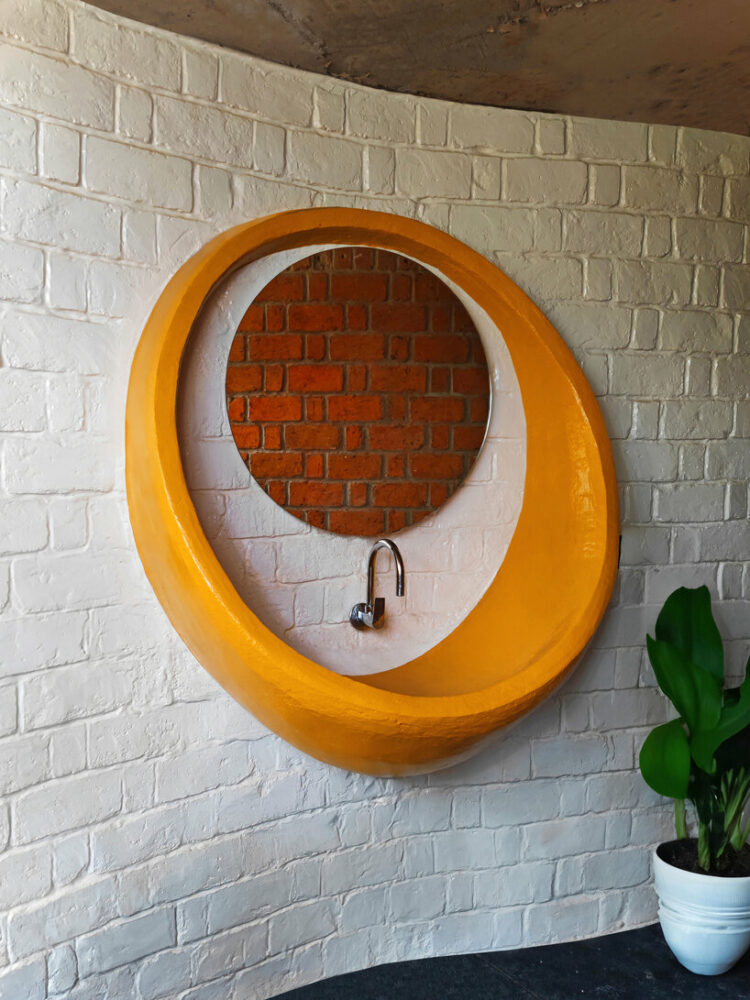 the project sits like a ring placed over the terrain, with its funnel-like roof forming a shaded perimeter walkway and an introverted core.