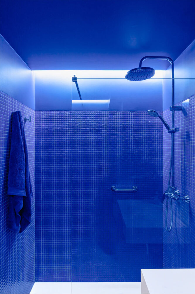 functional yet striking, the wall integrates cabinets, shelves, and hidden appliances into the home