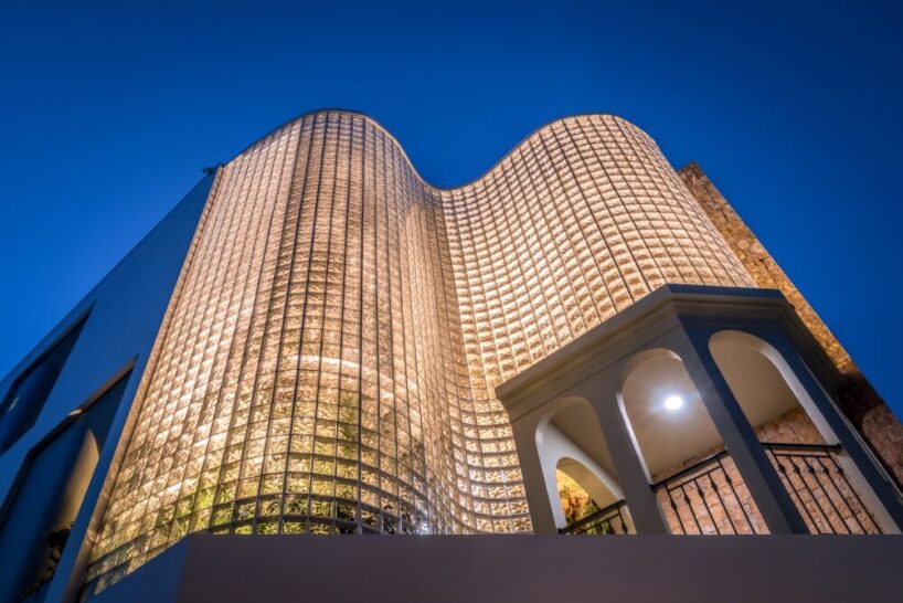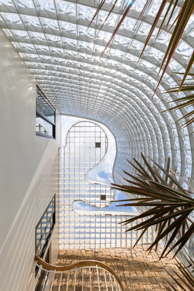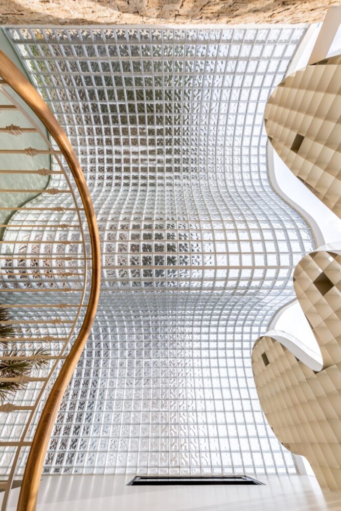 the project sits like a ring placed over the terrain, with its funnel-like roof forming a shaded perimeter walkway and an introverted core.