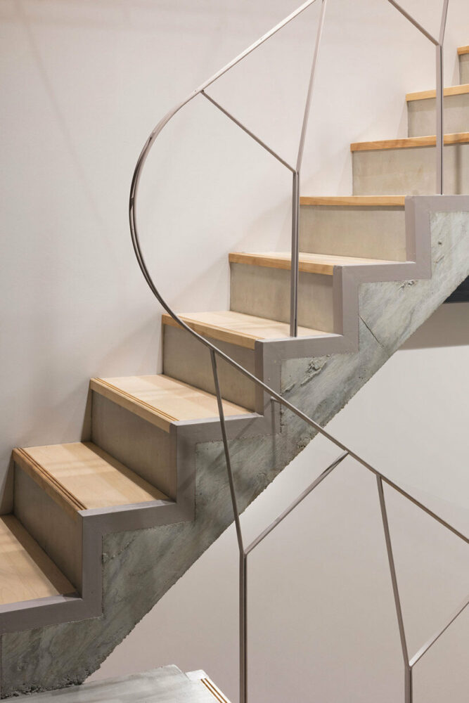 Since the size of the plot does not allow horizontal flexibility, the architects put emphasis on verticality and more specifically the staircase. The stairs were placed on the front side of the street, and the exterior wall was covered with curved glass, drawing an arch. In this way, the staircase draws light into the dining room on the second floor, while the transparency of the glass makes users feel like they are climbing up to the sky.