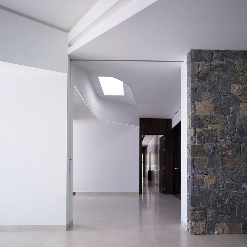 The residence is composed of three levels, each serving distinct functions. The basement level contains the garage and service areas, the first floor includes bedrooms for children and guests as well as a gym and spa, while the uppermost floor houses the primary living spaces, kitchen, pool, and master suite. Internally, all three floors are organized using rectilinear plans to optimize spatial efficiency and layout clarity. While the internal layout remains orthogonal, the exterior shell introduces curvature to modulate the building’s appearance and to establish a gradual, immersive arrival experience. Large cantilevered terraces, including a 21-meter pool with a 6-meter overhang, extend from the structure to provide covered outdoor spaces and to reduce the building’s perceived bulk. A triple-height entrance lobby marks the transition from exterior to interior, enhancing spatial legibility.