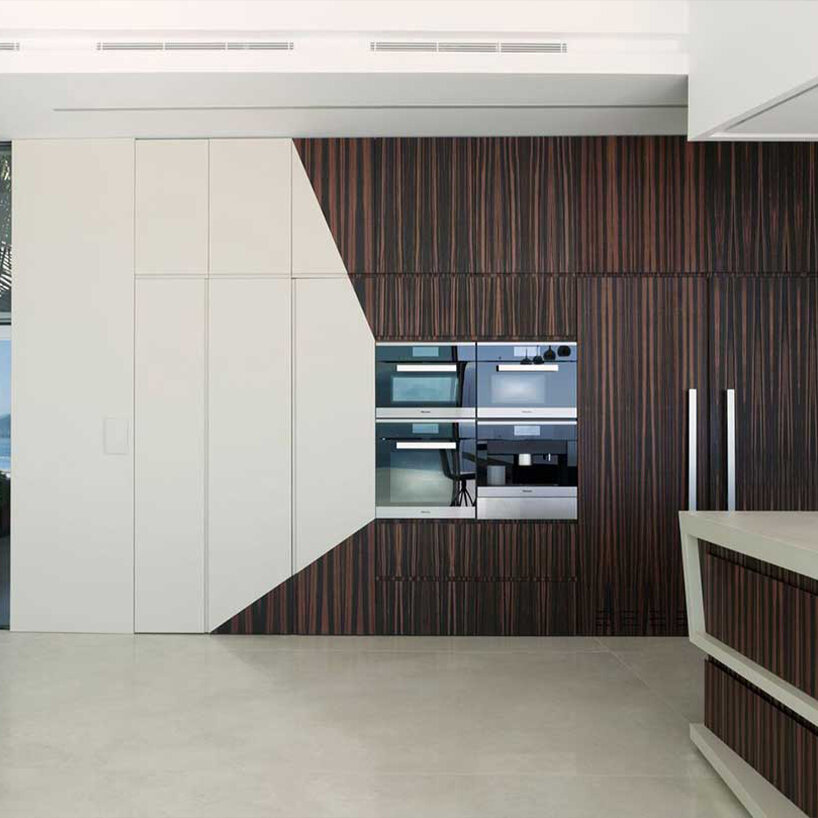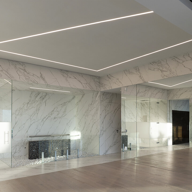 The material palette reflects regional building traditions and climatic considerations. Exterior walls are finished in a white multilayer coating, referencing Mediterranean typologies. Expanses of glazing with graphite-colored frames are set back beneath the curving slabs, accentuating the horizontal planes and cantilevered geometry. Interior finishes reinforce the architectural language through custom millwork with curved profiles, combining white lacquer and dynamic-grained natural wood. Large-format porcelain panels define bathroom volumes and spa areas, while neutral-toned flooring establishes continuity throughout. For the lighting design, the architectural team at Ramón Gandía Brull SLP – RGB Arquitectos maintains the house’s themes of movement and sectional layering. Linear fixtures are used both indoors and along the building perimeter to highlight the curvature and to unify the various spatial sequences.