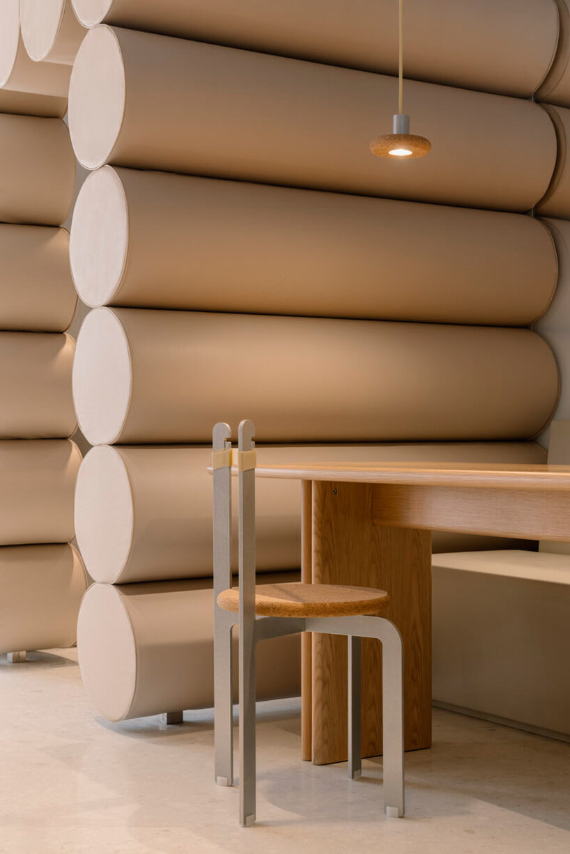the facade features long tables with seating on both sides for social interactions