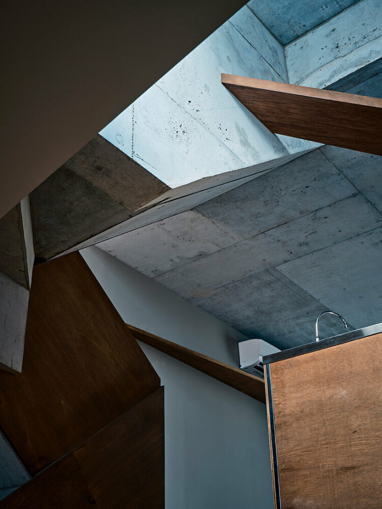 These compositions also triggered other design decisions, namely integrating platforms at a diagonal angle with the stairwell running between the staggered floors, adding a corresponding angle to storage on the opposite wall, and lastly, placing a triangular light garden at the end of a large opening in the living room to create a diagonally oriented axis, making it feel more spacious.