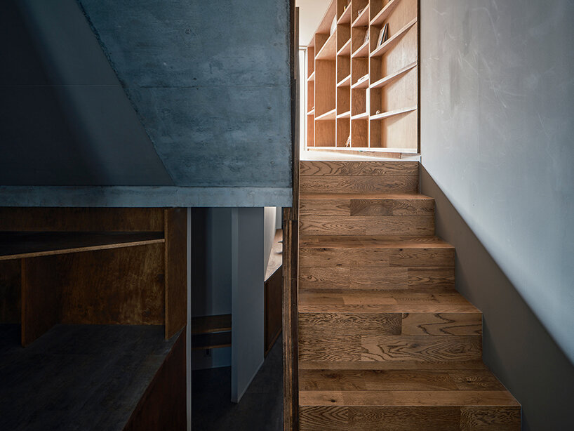 To further emphasize this spatial continuity inside ‘Diagonal House’, id+fr (see more here) injected a slab above the living room, folding upwards along a slanted line. Meanwhile, the duo partially raised the uppermost slab to make room for a large kitchen terrace opening. ‘These design arrangements resulted in some features that encourage alternative activities: the sloped floor of the terrace can be used for sunbathing, and the space underneath the raised section of the topmost slab became an alcove for sleeping,’ explain Daisuke Ibano and Ryosuke Fujii.