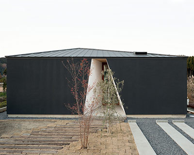 the project sits like a ring placed over the terrain, with its funnel-like roof forming a shaded perimeter walkway and an introverted core.