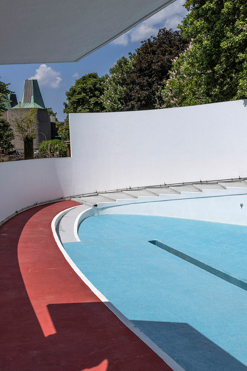 the project sits like a ring placed over the terrain, with its funnel-like roof forming a shaded perimeter walkway and an introverted core.