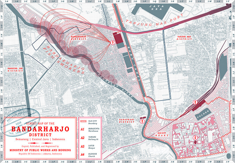 The right way to go about it, Harianto says, is to sympathize without outsmarting the indigenous community. After careful research into the local conditions, he first proposes securing the perimeter of the smoked fish compound currently sprawled along the Semarang riverbank. This suggestion arises from a belief that locals will lose the land to subsidence a few decades from now. Therefore, ‘immediate relocation is necessary, distinctly to save the people’s economic activity,’ states Harianto.
