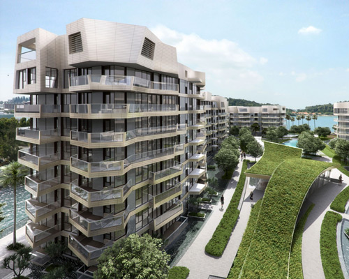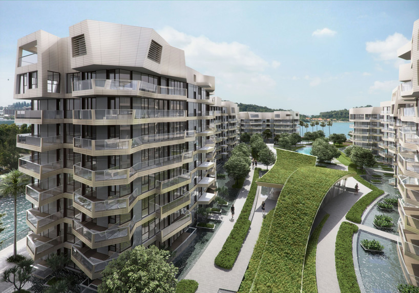 designed by daniel libeskind, ‘corals’ is a sustainable mid-rise residential complex situated on singapore’s keppel bay. scheduled for completion in 2017, the 11-buliding scheme ranges in height from 4 to 12 storeys and comprises 366 waterfront homes. instead of building up along the shoreline, the plan is arranged in a V-formation, ensuring sweeping views of the bay from even the furthest set back units. the project is the second that studio libeskind has designed for keppel land international, after ‘reflections’ completed in 2011.
