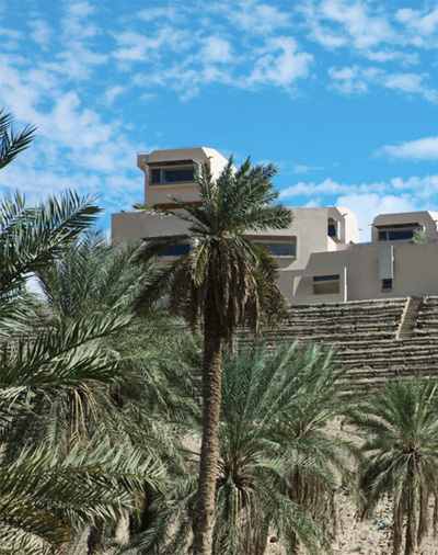a pilotis of the Dar HI hotel overlooking the palm oasis image courtesy Dar HI